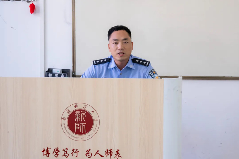 新疆师范大学派出所三级警长王化坤警官为新生开展校园法制安全讲座。讲座围绕网络反诈骗、网络安全、人身安全、宿舍安全等普法安全教育等方面展开,通过大量案例生动形象的为同学们讲解了“安全防范第一课”,引导同学们自觉将法制安全知识入脑、安全意识入心,为创建和谐校园打下了坚实基础。